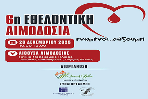 «Νέα Δυτική Ελλάδα»: Εθελοντική αιμοδοσία στον Πύργο το Σάββατο 20 Δεκεμβρίου