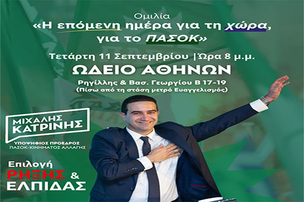 Μιχάλης Κατρίνης: Κεντρική προεκλογική ομιλία την Τετάρτη 11 Σεπτεμβρίου στο Ωδείο Αθηνών