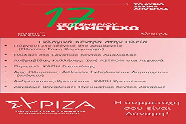 ΣΥΡΙΖΑ Π.Σ.: Στις 17 Σεπτεμβρίου η ψηφοφορία για εκλογή προέδρου - Τα εκλογικά κέντρα στην Ηλεία