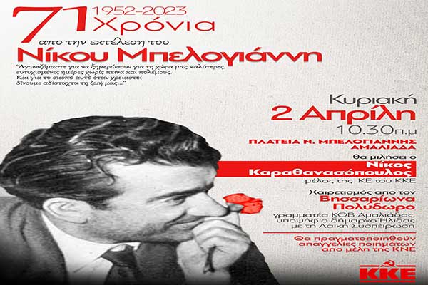 ΚΚΕ: Εκδήλωση την Κυριακή 2/4 στην Αμαλιάδα για τα 71 χρόνια από την εκτέλεση του Νίκου Μπελογιάννη