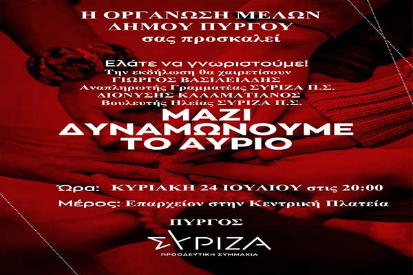 ΣΥΡΙΖΑ Πύργου: Συνάντηση γνωριμίας αύριο Κυριακή στο Επαρχείο