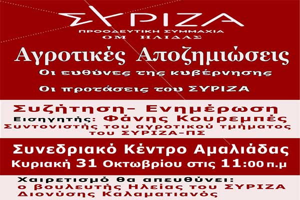 ΣΥΡΙΖΑ Ήλιδας: Στις 31/10 η εκδήλωση-συζήτηση «Οι αγροτικές αποζημιώσεις και τα συσσωρευμένα προβλήματα των παραγωγών»