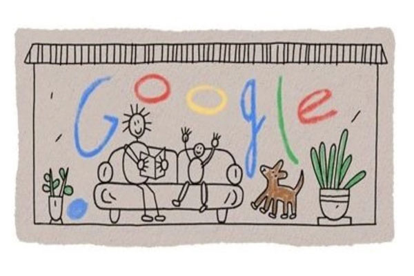 Το Doodle αναπαριστά μια γυναικεία φιγούρα να διαβάζει ένα βιβλίο σε ένα χαρούμενο παιδί στο σαλόνι ενός σπιτιού.